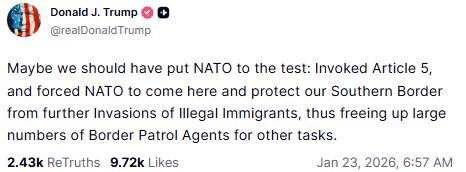 "Maybe we should have put NATO to the test: Invoked Article 5, and forced NATO to come here and protect our Southern Border from further Invasions of Illegal Immigrants, thus freeing up large numbers of Border Patrol Agents for other tasks."