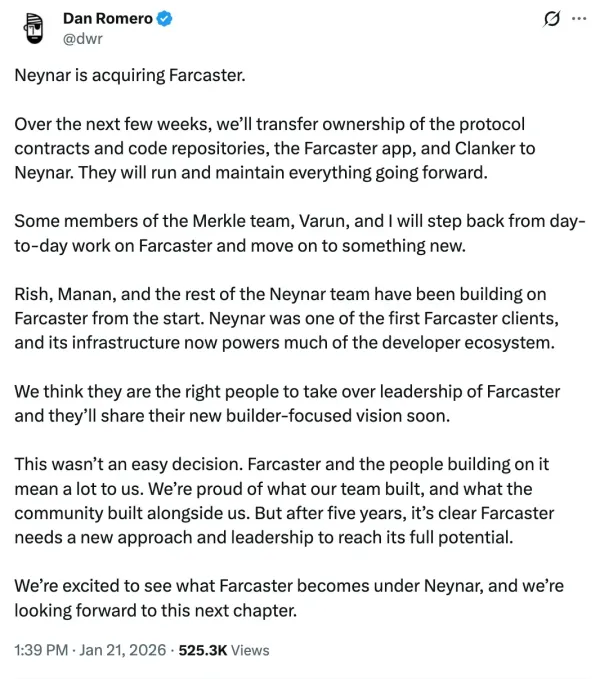 - Farcaster co-founder Dan Romero said the protocol is not shutting down and will transition to new leadership under Neynar.
