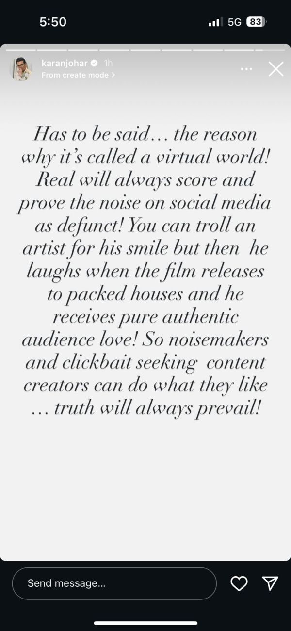 Praising Varun's performance, Karan wrote, "Has to be said... the reason why it's called a virtual world! Real will always score and prove the noise on social media as defunct! You can troll an artist for his smile but then he laughs when the film releases to packed houses and he receives pure authentic audience love!"