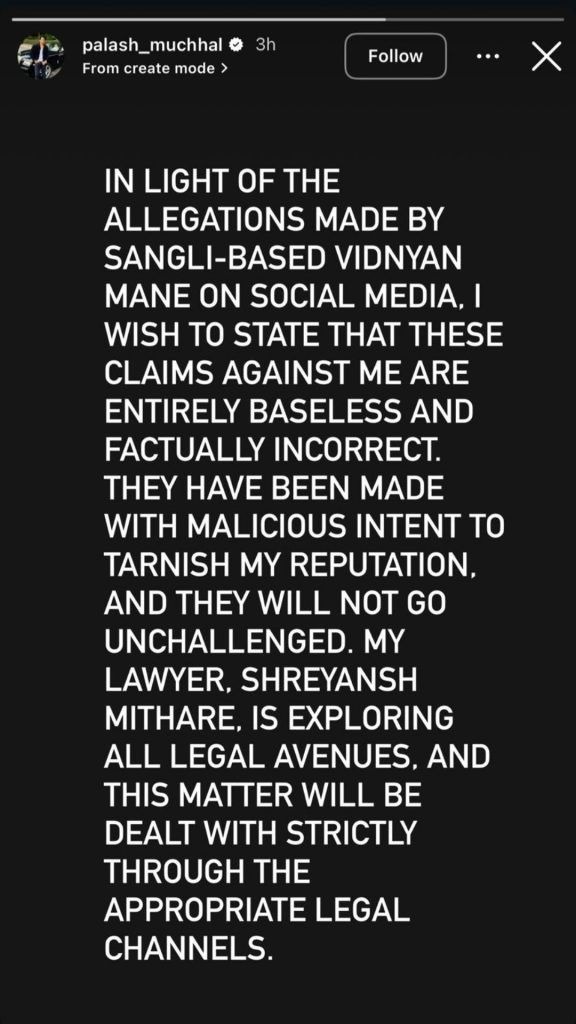 Following this incident, Mane submitted a written complaint to the police. Officials have confirmed that a preliminary inquiry is currently underway. As of now, Palash Muchhal has not made any public statement in response to these allegations.