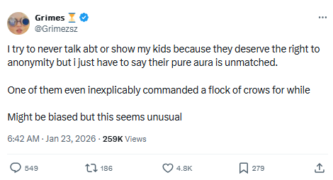 Grimes talks about the ‘unusual’ about her and Elon Musk’s childrenTaking to social media platform X (formerly Twitter), the 37-year-old singer wrote, “I try to never talk abt or show my kids because they deserve the right to anonymity but I just have to say their pure aura is unmatched.”