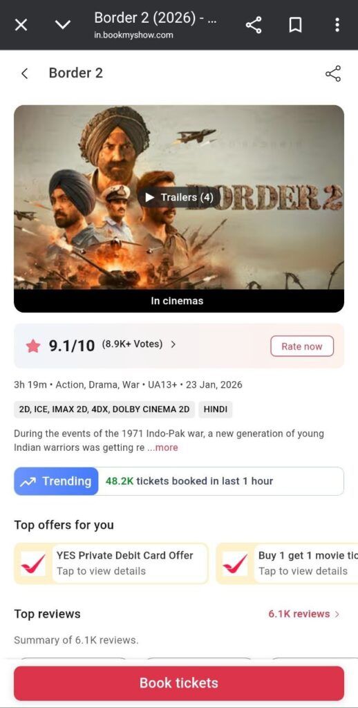 At the time of writing this report, Border 2 was witnessing an exceptional response in Hyderabad, reflecting strong audience interest in the city. According to BookMyShow data, the film was marked as “Trending” with over 48,000 tickets booked in the last one hour, indicating a sharp surge in advance and spot bookings. The impressive numbers highlight the film’s growing momentum in the Hyderabad market and suggest a robust opening driven by positive word-of-mouth and high viewer curiosity.