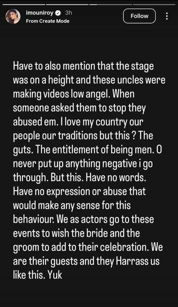 Taking to her Instagram Stories on Saturday, Mouni detailed the incident, claiming that as she arrived at the venue and walked towards the stage, some male guests behaved inappropriately under the pretext of clicking photographs. According to her account, a few elderly men allegedly placed their hands on her waist, prompting her to ask them to stop.