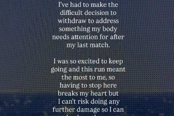 Osaka posted on Instagram : "I've had to make the difficult decision to withdraw to address something my body needs attention for after my last match. I was so excited to keep going, and this run meant the most to me, so having to stop here breaks my heart, but I can't risk doing any further damage, so I can get back on the court.