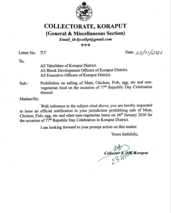 According to local reports, the ban, which applies to sales throughout urban and rural areas of the Koraput district, marks the first time such a restriction has been imposed locally for Republic Day.