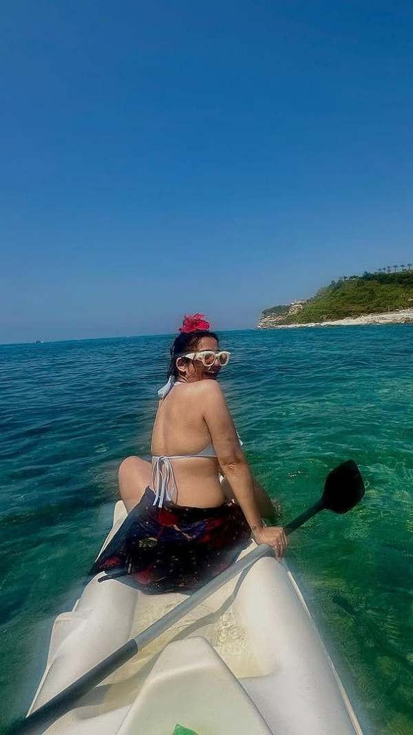 Jasmine enjoying a ride into ocean in skimpy bikini top & wraparound sunglasses.