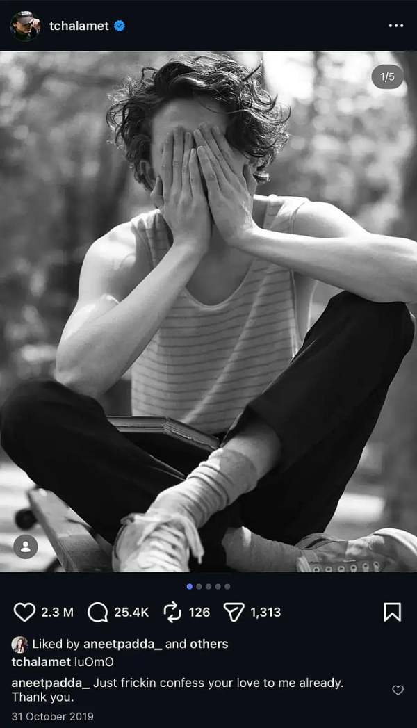 Eagle-eyed fans recently spotted Aneet's comment on a 2019 Instagram post shared by Timothée. Gushing over him, she wrote, "Just frickin’ confess your love to me already. Thank you," in response to his black-and-white photos, where he was casually sitting, wearing a striped vest and covering his face.