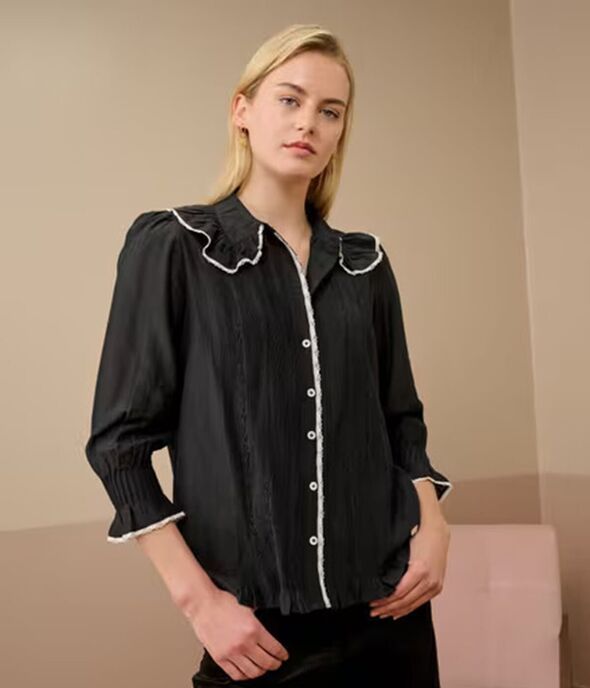 Staying true to the TV star's edgy style, the blouse combines bohemian and feminine elements. The blouse has a distinctive frilled collar and fluttered three-quarter-length sleeves, giving it a romantic touch. It fastens with a series of dainty buttons at the front and features embroidered details. It's also trimmed with delicate lace along the sleeves and collar, and while Claudia wore it in black with a contrasting white lace trim, it's also available in a deep forest green if that's more your speed.