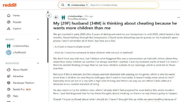 In the middle of the honeymoon, the woman saw some search queries on her husband's other phone, which were very shocking. The questions were – “Is it bad to have more than one wife?” and “How to convince someone to have kids outside of marriage?” Even if there was no actual cheating, the mere thought of such questions became a deep red flag for the woman. She felt that the husband was thinking of breaking the boundaries of marriage in the future.