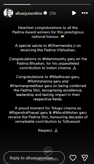 Proud moment for Telugu cinemaAllu Arjun called it a proud day for Telugu cinema. He congratulated Rajendra Prasad and Murali Mohan. His words were, “A proud moment for Telugu cinema as #Rajendra Prasad garu & #Murali Mohan garu receive the Padma Shri, honouring decades of remarkable contribution to Tollywood. Respect.”
