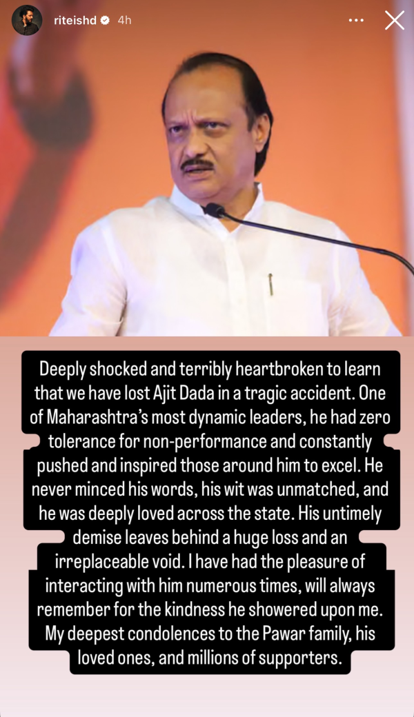 Riteish DeshmukhTaking to his Instagram Stories, the 'Bigg Boss Marathi' Season 6 host and actor shared, "Deeply shocked and terribly heartbroken to learn that we have lost Ajit Dada in a tragic accident. One of Maharashtra's most dynamic leaders, he had zero tolerance for non-performance and constantly pushed and inspired those around him to excel. He never minced his words, his wit was unmatched, and he was deeply loved across the state. His untimely demise leaves behind a huge loss and an irreplaceable void. I have had the pleasure of interacting with him numerous times, will always remember for the kindness he showered upon me. My deepest condolences to the Pawar family, his loved ones, and millions of supporters."