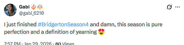 A netizen tweeted, "I just finished #BridgertonSeason4 and damn, this season is pure perfection and a definition of yearning (sic)." Another netizen wrote, "OK OVERALL IT’S AMAZING FOR PART 1, thank you Sophie Baek for gracing us with your presence. The chemistry, the story, and I actually love the subplots ngl. I can’t believe they’re making me wait another month for part 2. (sic)."