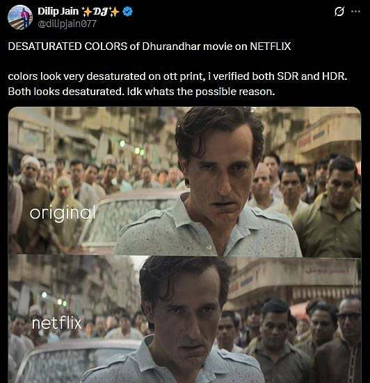 Another X user tweeted, "DESATURATED COLORS of Dhurandhar movie on NETFLIX colors look very desaturated on ott print, i verified both SDR and HDR. Both looks desaturated. Idk whats the possible reason (sic)."