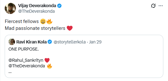 Re-sharing his post, Vijay Deverakonda added words for both of his directors. He wrote, “Fiercest fellows. Mad passionate storytellers.”