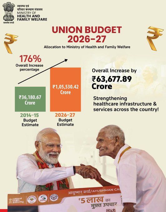 The Union Budget 2026-27 has allocated Rs 1,05,530.42 crore to the Ministry of Health and Family Welfare, marking an overall increase of 176 per cent since 2014-15.