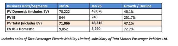 New Delhi: Tata Motors Passenger Vehicles on Sunday reported a 47 per cent year-on-year growth in total sales to 71,066 units in January. The brand dispatched 48,316 units in January 2025.