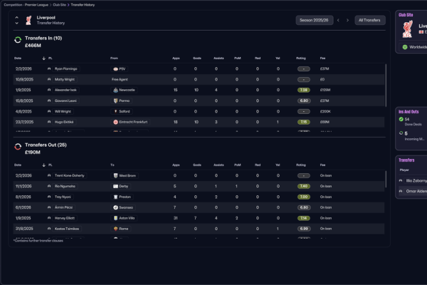 Despite spending as much as £430m in the summer, Liverpool didn't feel the need to balance the books on transfer activity in January 2026. Instead, all four of the departures during the simulated window went out on loan.