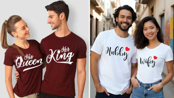 White or light-coloured T-shirts printed with “Hubby” and “Wifey,” highlighted using a red heart motif, create a warm and affectionate look. These pair well with jeans or relaxed trousers, making them suitable for casual Valentine’s celebrations.