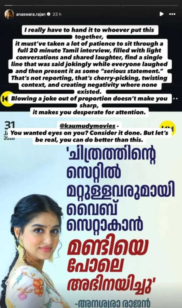 However, the actress said that one line from the conversation was taken out of context and given a serious spin in headlines that soon went viral. Taking to social media, Anaswara called out the reporting directly. “I really have to hand it to whoever put this together. It must’ve taken a lot of patience to sit through a full 20-minute Tamil interview filled with light conversations and shared laughter, find a single line that was said jokingly while everyone laughed, and then present it as some ‘serious statement,’” she wrote. She added, “That’s not reporting, that’s cherry-picking, twisting context, and creating negativity where none existed.”