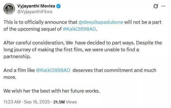 The post read, "This is to officially announce that @deepikapadukone will not be a part of the upcoming sequel of #Kalki2898AD. After careful consideration, we have decided to part ways. Despite the long journey of making the first film, we were unable to find a partnership. And a film like @Kalki2898AD deserves that commitment and much more. We wish her the best with her future works."