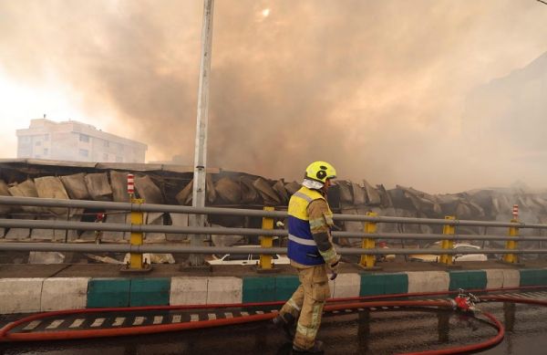 media show thick black smoke and towering flames rising from the market. Nearby residential and commercial areas are in a state of panic. The scene is terrifying for Tehran residents.