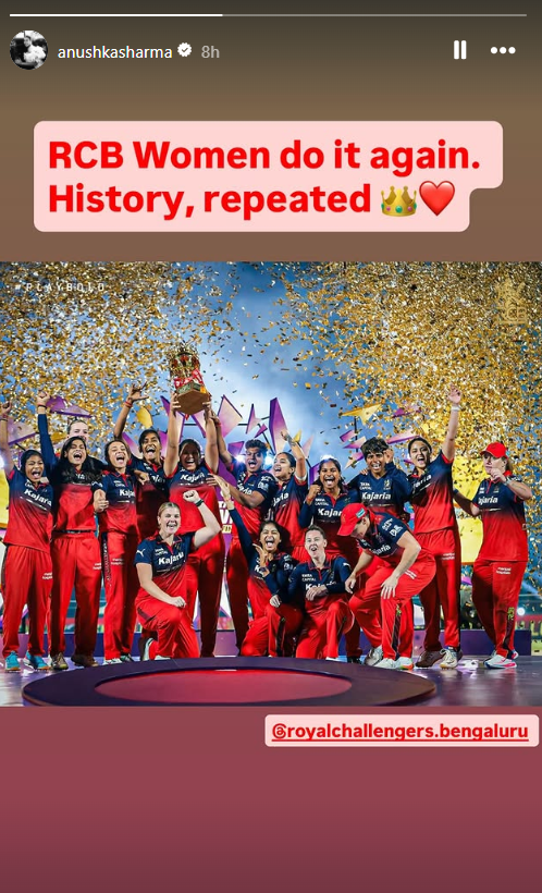 Soon after the win, Anushka took to Instagram to share a photo of the RCB Women's team celebrating with the trophy.