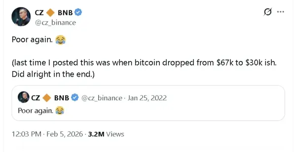 “Poor again,” CZ wrote in a post on X, noting that the last time he used this phrase was during Bitcoin’s drop from $67,000 to roughly $30,000, during the 2022 crypto slump.