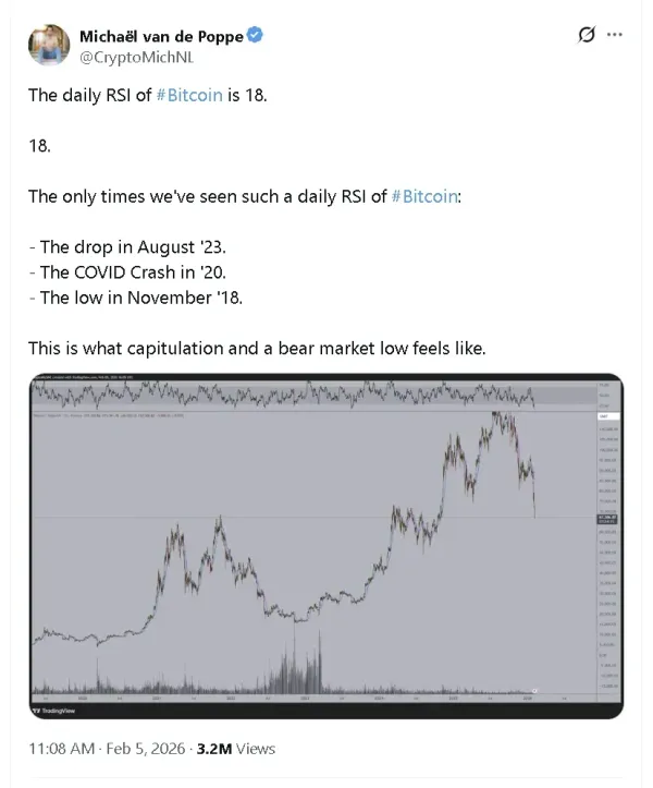 MN Fund founder and chief investment officer Michael van de Poppe pointed to Bitcoin’s daily relative strength index (RSI), which recently fell to 18. He said such levels have only appeared during a handful of major stress events, including the COVID crash in 2020, the market low in November 2018, and the sharp selloff in August 2023. Van de Poppe described the reading as characteristic of capitulation and conditions typically seen near bear market lows.