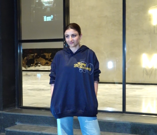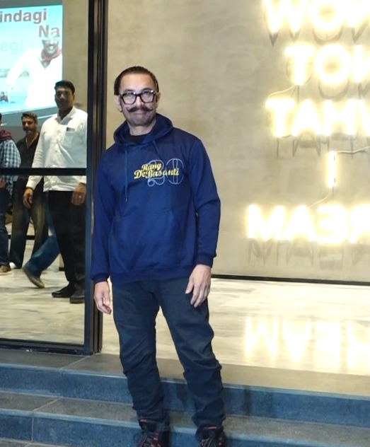 Aamir Khan arrived at the event in a custom hoodie bearing the name "Rang De Basanti," paired with black pants and brown shoes.