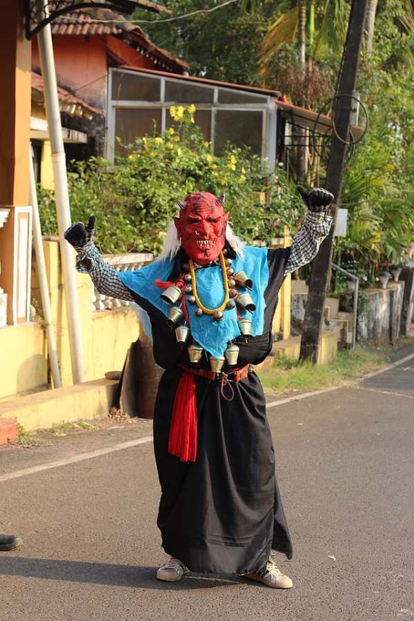 Somewhere in the quiet bylanes of Divar island, a group of men gather in a house earmarked for a meeting. In hushed tones, they hunch over tables stacked with gory masks, tufts of fake red and blue hair, and straps of cowbells. Between jokes and shared memories, each one picks the items of their choice as the group readies for the day ahead.