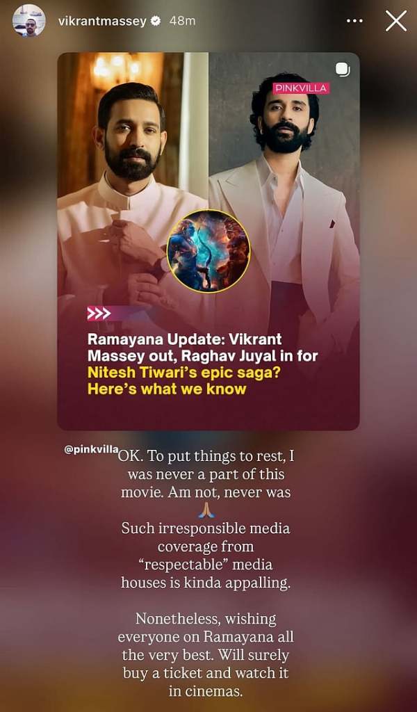 Amid the reports, Vikrant reacted to the news of Raghav supposedly replacing him and lashed out at the media portal Pinkvilla for publishing the story. He shared a clarification on his Instagram story, stating that he was never a part of the movie.