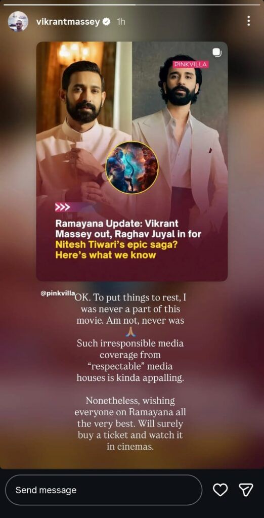Vikrant’s Instagram PostTo put the speculation to rest, Vikrant took to his Instagram Story and said, “OK. To put things to rest, I was never a part of this movie. Am not, never was. Such irresponsible media coverage from ârespectable’ media houses is kinda appalling. Nonetheless, wishing everyone on Ramayana all the very best. Will surely buy a ticket and watch it in cinemas.”