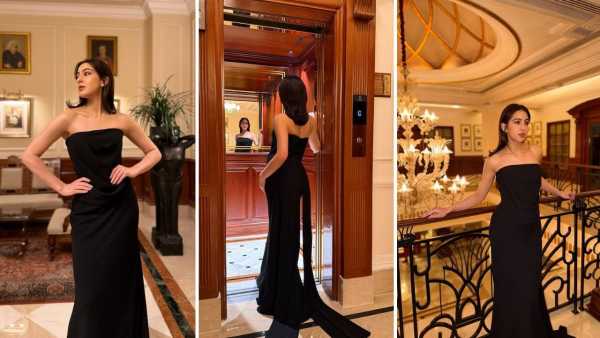 Sara Ali Khan opted for understated glamour in a black off-shoulder gown featuring a cowl neckline and a dramatic back waist knot with flowing drapes. The fluid silhouette added movement and sophistication, while the minimalist styling kept the focus on the design. With her hair left open and only small earrings for accessories, Sara proved that simplicity can be striking. The look impressed netizens for its quiet confidence and refined red-carpet appeal.