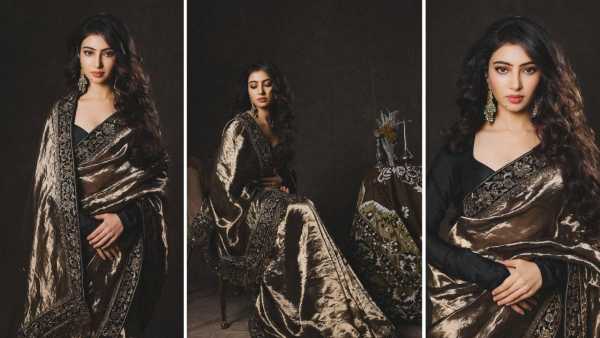 Sara Arjun impressed fashion critics and fans alike at the premiere of her film Euphoria in a custom tissue silk saree by Divani. The saree’s metallic sheen lent it a regal touch, paired thoughtfully with a full-sleeved black blouse. Minimal accessories and statement earrings enhanced the elegance without overpowering the look. Praised for its maturity and refinement, the ensemble highlighted Sara’s evolving fashion sense and set her apart as a rising style force.