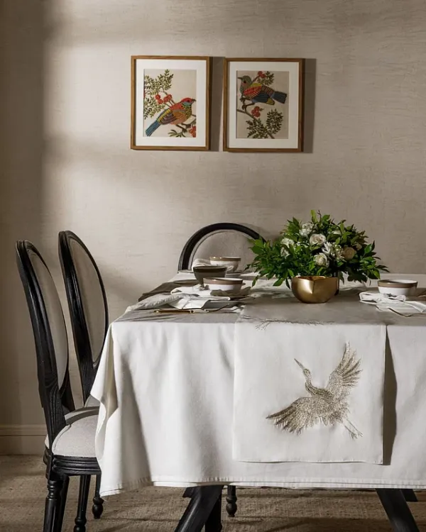 • Lay down an embroidered runner for textural interest, then artfully arrange platters and candleholders for a sense of occasion.