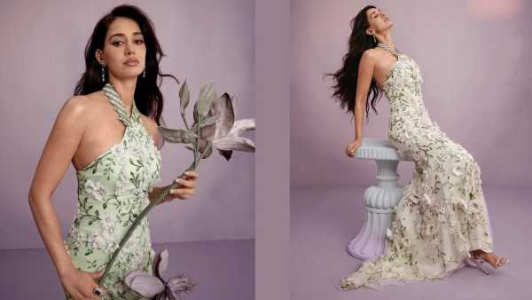 She steps into soft elegance wearing a white floral halter-neck gown detailed with green climbing leaf motifs. The backless design adds subtle drama while keeping the overall mood light. Leaving her hair untied and choosing minimal jewellery allows the gown’s delicate print and fluid silhouette to remain the focus, creating an effortless, breezy statement.