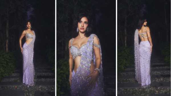 Turning up the glamour, she wears a lavender lilac sheer saree embellished with silver crystals that shimmer under light. The matching blouse features a bold neckline and multiple back straps, adding visual interest. Coordinated jewellery and loose hair complete the look, keeping it sensual yet polished.