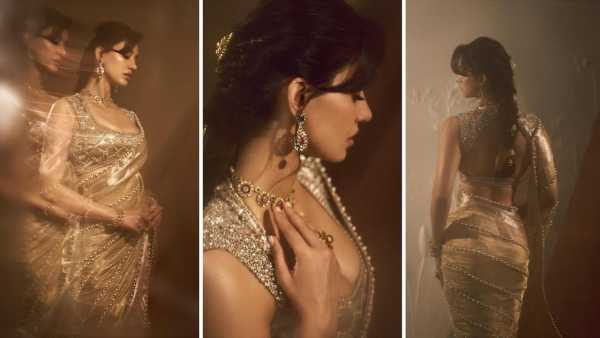 Disha Patani dazzles in a Manish Malhotra gold tissue saree that flows like liquid sunlight. Pearls scattered across the drape add texture and vintage romance. The sleeveless blouse features a deep neckline, black keyhole detail and intricate crystal and pearl work. Minimal yet striking jewellery, a floral choker, earrings, bangles and a loosely braided hairstyle let the saree command attention.