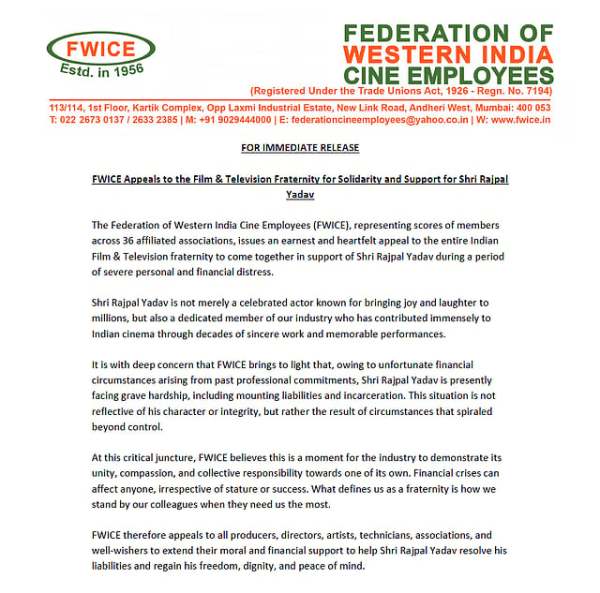 In an official statement, FWICE wrote, "It is with deep concern that FWICE brings to light that, owing to unfortunate financial circumstances arising from past professional commitments, Shri Rajpal Yadav is presently facing grave hardship, including mounting liabilities and incarceration. This situation is not reflective of his character or integrity, but rather the result of circumstances that spiraled beyond control."