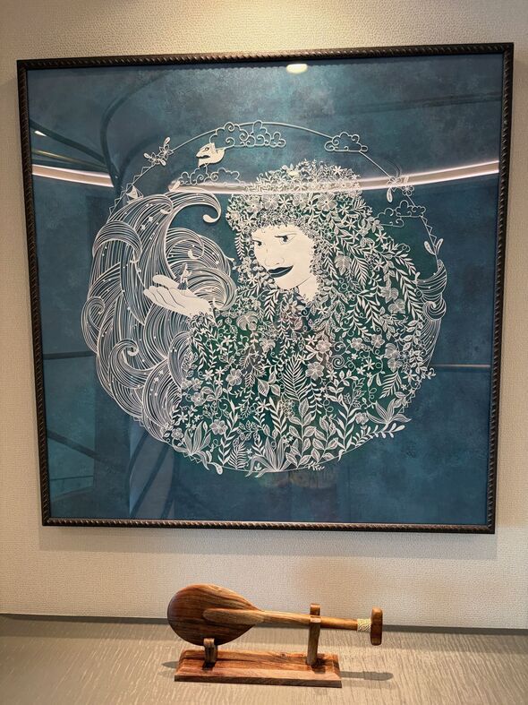 As soon as you enter, it's clear that this is no ordinary cruise ship cabin. The suite is inspired by the beloved animated film Moana, with beautiful artwork and an eye-catching sculpture greeting you as you step in. The main area is a huge open plan living and dining area with a few sofas, sideboards and a coffee table, a large dining table.