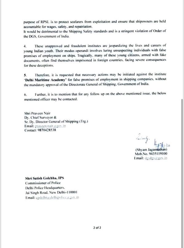 According to complaints, DMA projected itself as a DGS-approved institute and promised 100% placement in Merchant Navy jobs. Following complaints, the Directorate General of Shipping conducted an inquiry and issued a public advisory on January 9 declaring that the institute’s claim of being DGS-approved was false. The advisory warned students not to fall prey to employment assurances made by the academy. On the same day, Director General of Shipping Shyam Jagannathan wrote to the Delhi Police Commissioner seeking action against the institute.