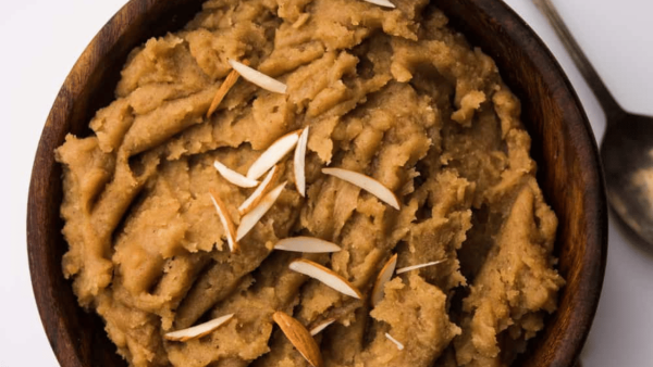 Roast 1 cup singhara (water chestnut) flour in ½ cup ghee over low heat for 6-10 minutes till fragrant and golden—no raw smell. Slowly stir in 1½ cups warm sugar syrup (dissolved sendha namak and cardamom), cooking till thick and ghee separates. Garnish with slivered nuts; this rich, pudding-like sweet is a divine prasad for post-puja indulgence.