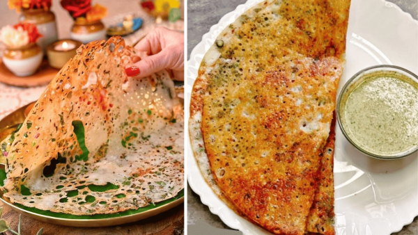Soak ½ cup sabudana and ½ cup sama (barnyard millet) for 3-4 hours, grind with water into a pourable batter, season with sendha namak and ginger-green chilli paste. Spread on hot ghee-smeared tawa, add optional potato filling, fold, and cook till crisp. These lacy crepes offer a South Indian twist to falahari meals, ideal for breakfast during your Shivratri fast.