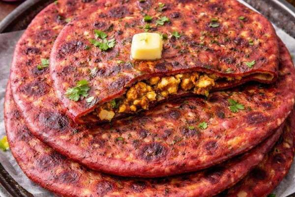 This is the best method for kids who don’t want to eat vegetables. Mix wheat flour with kora beet, jawan, green chillies and salt. A beautiful deep pink colored soft paratha is made by brushing with little ghee. A great combination of health and taste.