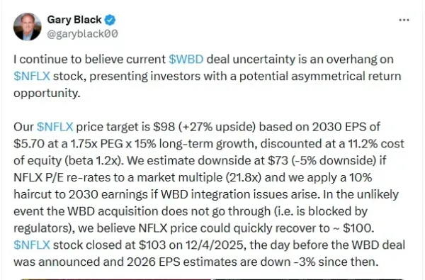 Gary Black on Tuesday in a social media post on X said that uncertainty over Warner bros deal is an overhang on Netflix’s (NFLX) stock.