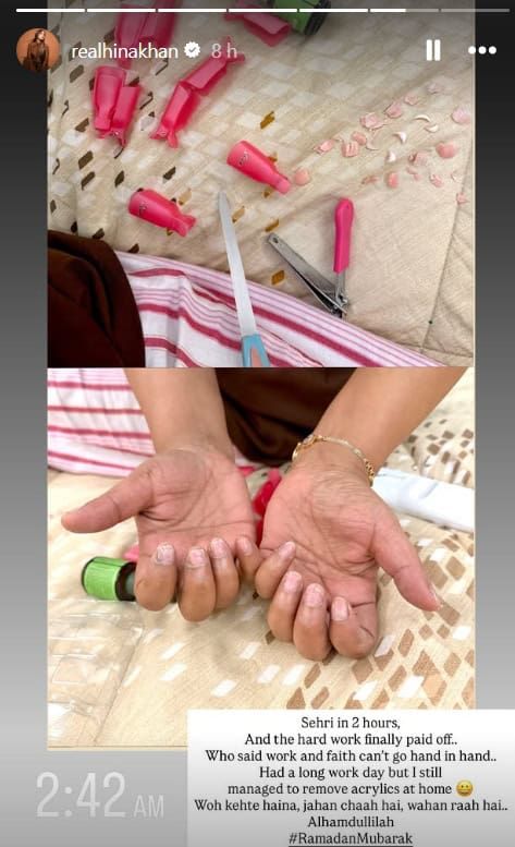 She shared a picture of her nails and captioned it: “Sehri in 2 hours. And the hard work finally paid off. Who said work and faith can’t go hand in hand. Had a long work day but I still managed to remove acrylics at home. Woh kehte haina, Jahan chaah hal, wahan raah bal…Alhamdullilah #Ramadan Mubarak.”