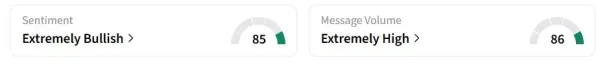 Despite the intraday slide, retail sentiment on Stocktwits turned ‘extremely bullish’ amid ‘extremely high’ message volumes.