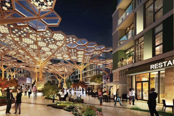 But it's the manmade 'forest' that really grabs visitors' attention. Giant tree-shaped sculptures have been erected all along the promenade, capped with hexagonal designs decked in more crystals. The tops of these trees have solar panels, which reportedly help to power the area and its outdoor air conditioning.