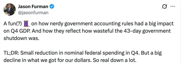 In a post on X, Furman called the longest shutdown in American history that began in Oct. 2025 "wasteful," adding that it subtracted 1.15 percentage points from the Q4 gross domestic product (GDP).