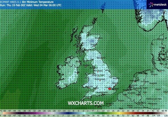 Charts from forecaster WXCHARTS show that, at midnight, southern England and stretching up towards the Midlands will remain predominantly dry. Nottingham, Stoke-on-Trent, Manchester, Blackpool and Hull are all set to see snow, whilst a small pocket of snowfall will also appear over Cairngorms National Park.